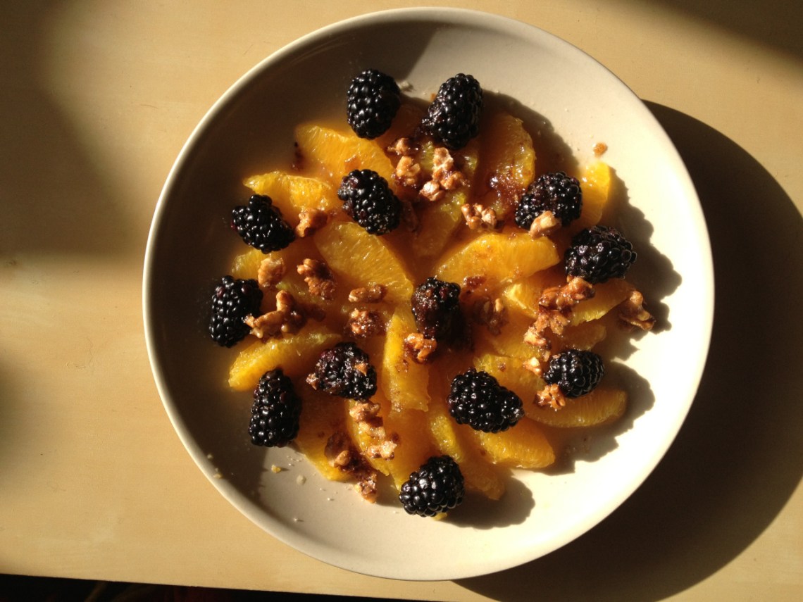 The walnuts have been toasted and tossed in a bit of caramelised sugar, the blackberries were a gift from the German-speaking grocer, and I segmented and removed all of the pith from the orange. We ate this with some natural unsweetened yogurt.