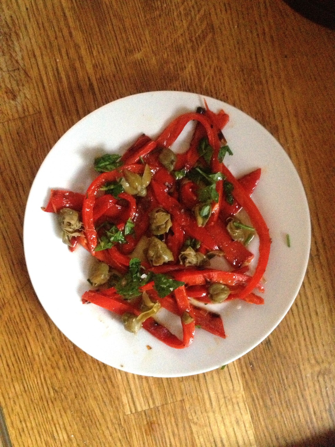 Scorched, peeled pepper salad with capers, parsley, lemon juice, olive oil and salt.