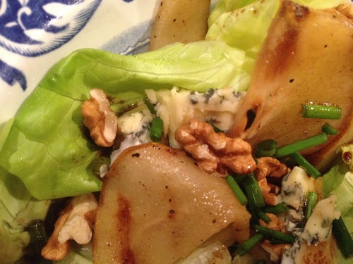 We had some Binham Blue cheese (made near Binham Priory in Norfolk) left from a birthday dinner and some eating pears and walnuts from the garden, so I made this salad. Griddling the pears is not strictly necessary, but does add some nice caramelisation that gives depth. The pears I used were quite firm. Binham blue is not overly strong and could be exchanged for another blue cheese.