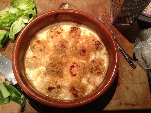 Cover them with white sauce, don’t worry if there’s a bit of stock still in the bottom of the oven dish. Then sprinkle over cheese, then breadcrumbs. Bake until browned on top.