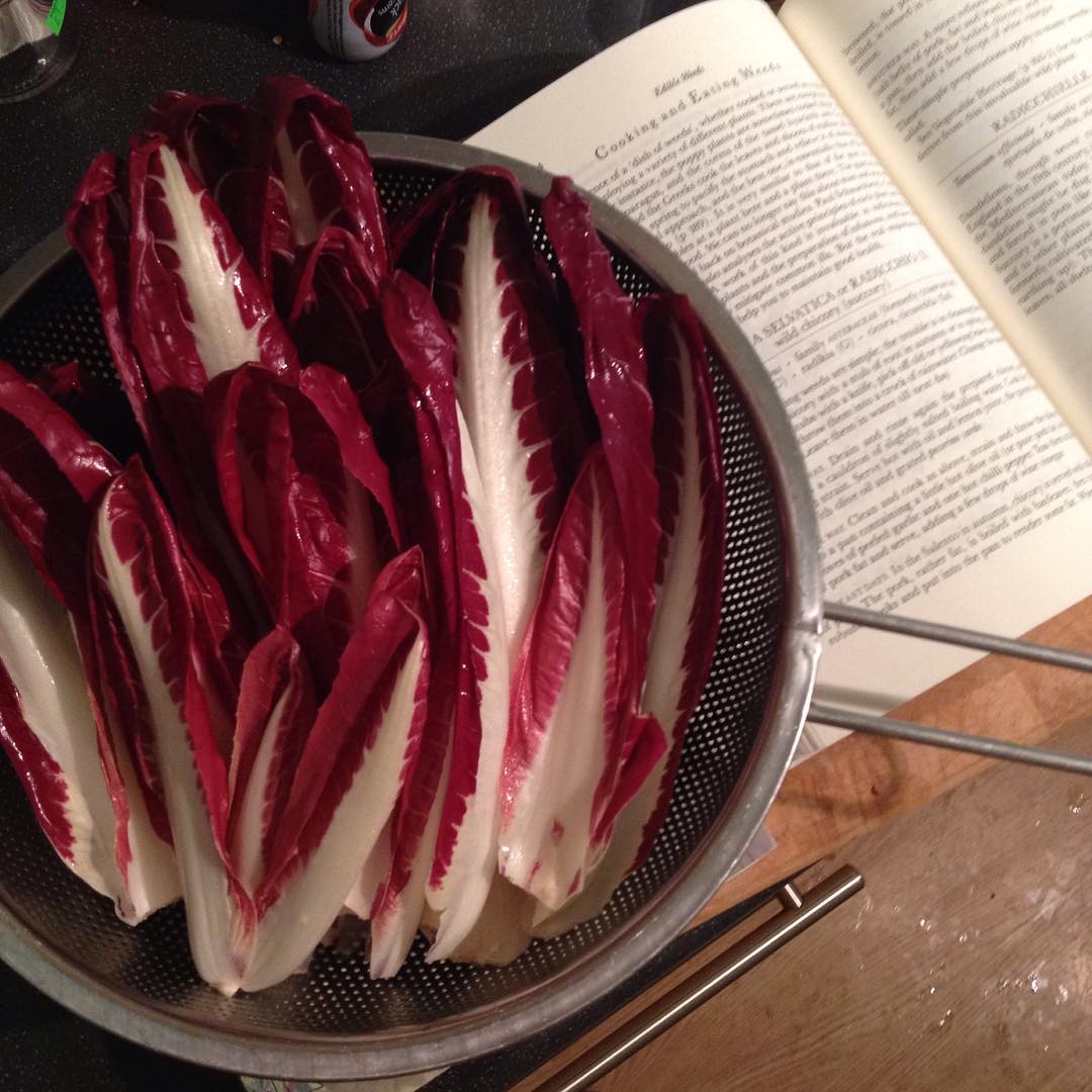 Ain’t no party like a Treviso party..boiled and tossed with fried pancetta and wine vinegar a la Patience Gray in Honey from a Weed. #cooking #cookbooks #vegetables #seasonal (at Peckham)