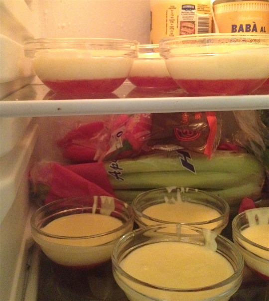 Then remove the set jellies from the fridge and gently spoon around 3-4cm of the posset mixture over the top. And leave to cool completely in a cold place in the house, then place in the fridge.