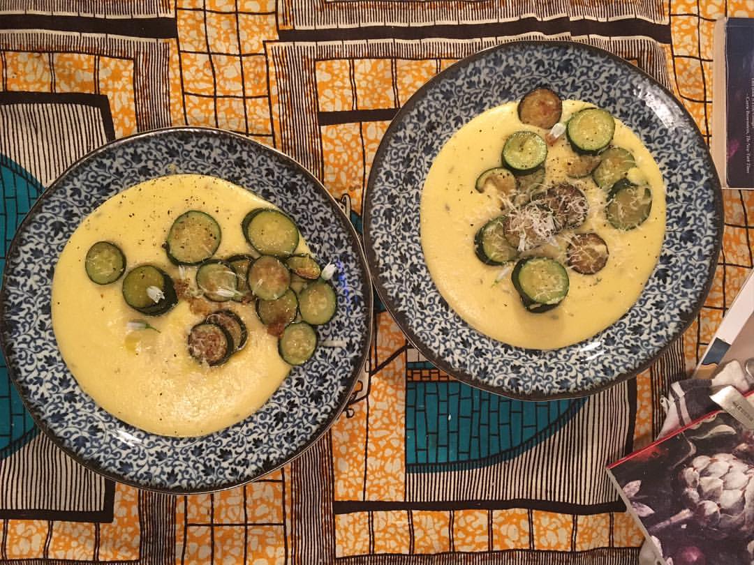 Soft buttery polenta with Parmesan, thyme and lemon, with courgettes sautéed in butter and garlic. Much needed comfort #vegetarian #comfortfood