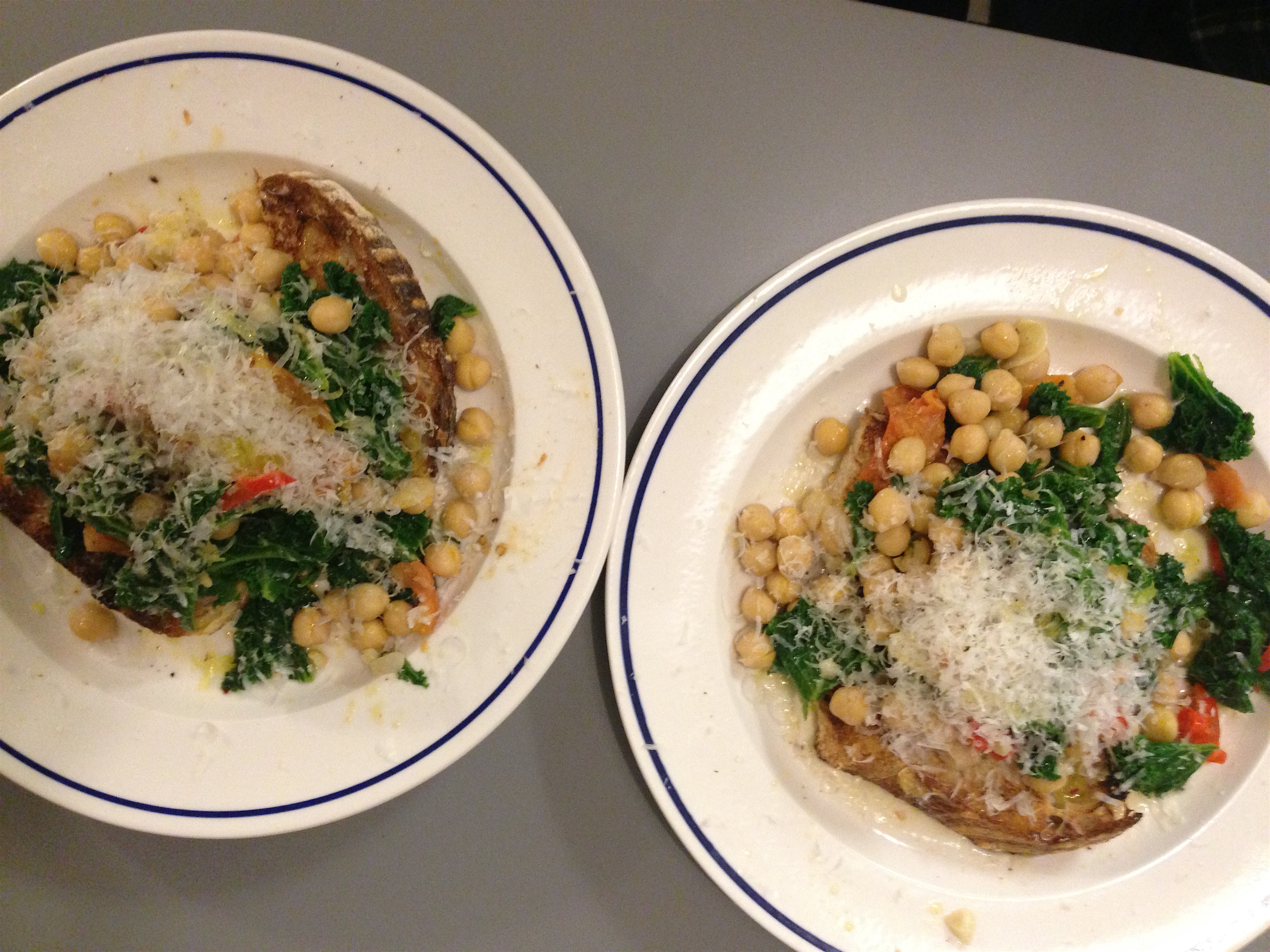 Place toast on plates, spoon over the kale and chickpea mixture and the reserved kale cooking liquid. Finish with another drizzle of oil, a touch of salt, a squeeze of lemon and a good grating of parmesan.
