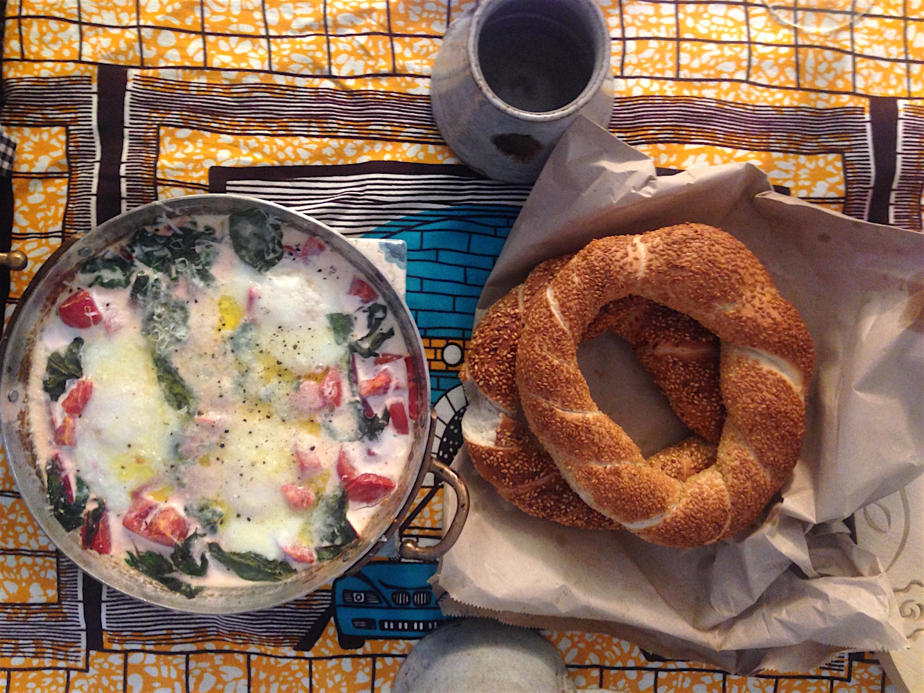 Turn the oven onto medium hot. You could also use spinach. Wash and then blanch a good handful of chard in salted water, then drain, squeeze out excessive water, and chop up roughly. Place in a smallish oven dish, enough to fit 4 eggs. Cut up a ripe tomato or two and add to the chard. Pour in of single cream so that it’s about a 2cm deep. Add a few leaves of basil or another fresh herb like parsley. Season with salt and pepper. Break in 4 eggs, add a few pieces of butter and cover with a fine grating of parmesan. Place in the oven until the eggs are just set. Spoon out portions onto a plate – 2 eggs each (or 1 if you prefer).