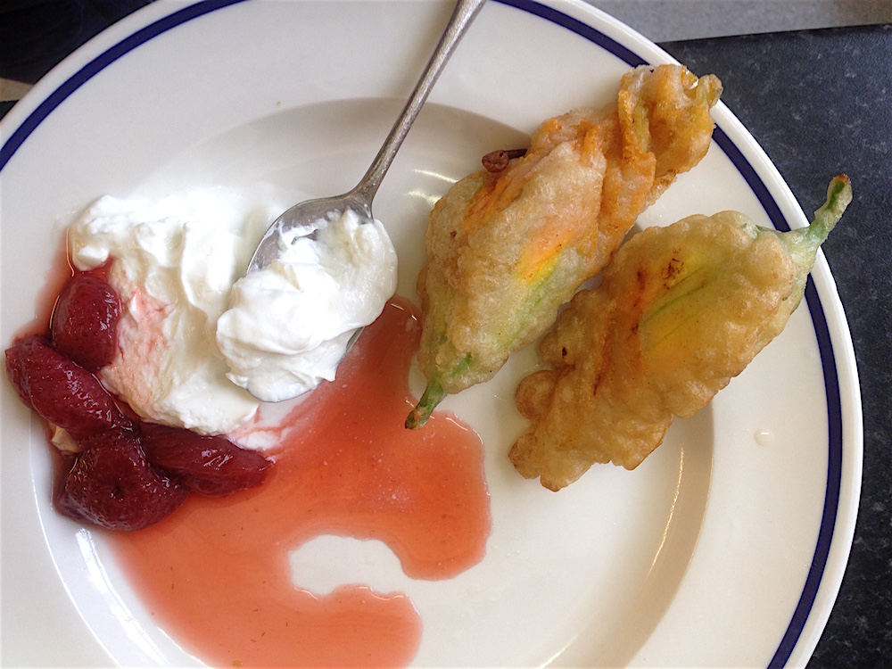I swiped the fried courgette flowers through the Greek yogurt, picking up a strawberry on the way. Smartened up this could be a nice dessert – sort of like fresh doughnuts or something.