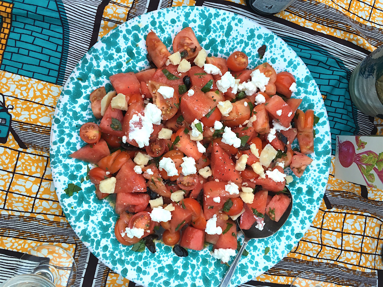 I first had a version of this salad a few years ago at Stevie Parle‘s restaurant Rotorino, when my friend Alex Jackson (founder of brilliant provençal restaurant, Sardine) was cooking there. It made a big impression on me – exhilarating and addictive without overwhelming. Last night, when it was briefly warm and sunny after days of grim rain, I made it for some friends to eat before a rich homemade pasta and ragu bolognese cooked by my partner Sam.