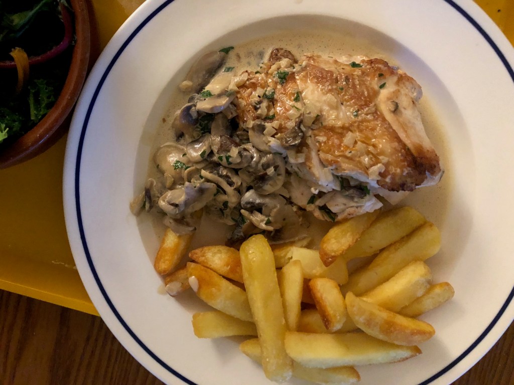 On Sunday afternoon I made a stock using the raw carcass (which, in my experience makes a better stock than that from leftover roast) and left it to cool with a lid on overnight. In the evening, I adapted a recipe I had seen in the skills test on ‘Masterchef: The Professionals’, and made pan roasted chicken breast with mushroom, mustard and brandy cream sauce. I used parsley instead of tarragon, breast instead of thigh, which I put it in an oven after initially sealing it then placing it on some greaseproof paper in the pan, and dijon mustard instead of wholegrain and cream instead of creme fraiche. We had it with oven chips and some mixed steamed greens with salt and pepper. Very, very good sauce. Very good with chips.