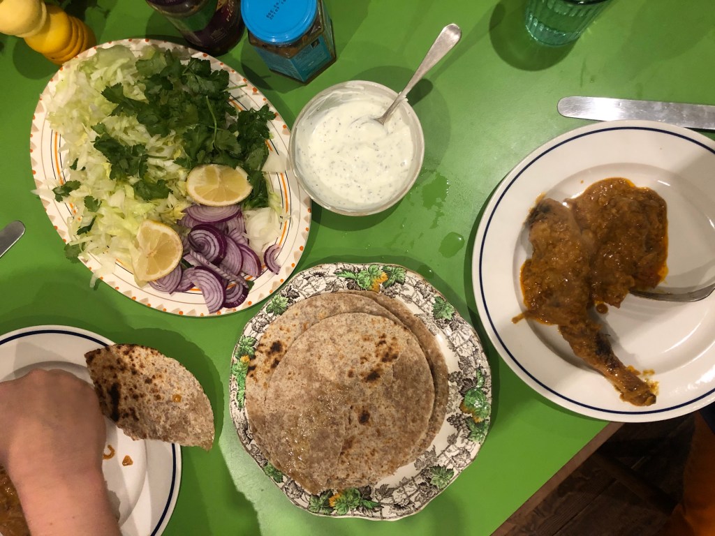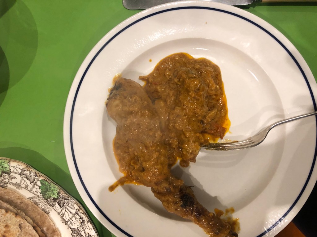 On Tuesday morning, I skinned then marinaded the remaining drumsticks and wings to the totally sensational Madhur Jaffrey chicken tikka masala recipe (Jaffrey uses breast), then in the evening made the sauce which didn’t take too long, and grilled the meat. I served it with shredded iceberg, sliced raw onion and fresh coriander with a wedge of lemon, yogurt raitha made with dried mint and a pinch of sugar and salt, and chapatis. And well, let me say, very much a platonic ideal of tikka masala cooked in a home kitchen.