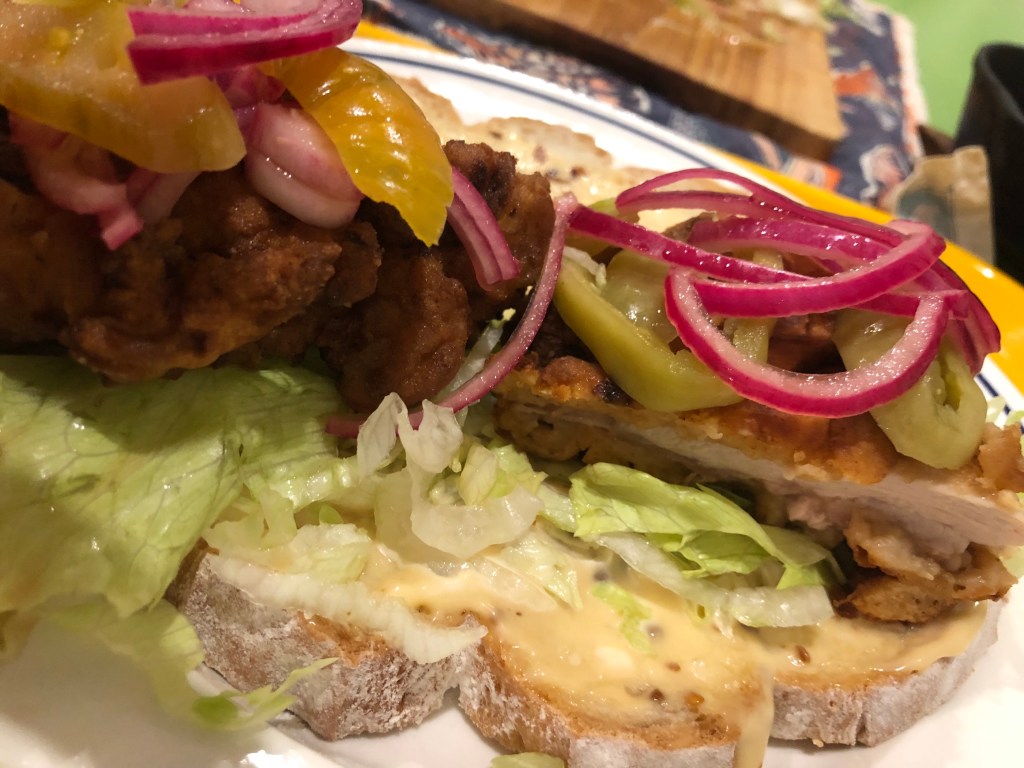 I marinaded the chicken first, as per instructions, and made a white sandwich loaf (the first I had ever baked) from the ‘Cook, Eat, Repeat’ book/tv series. It was a rather long day – significantly on account of my not having done washing up from the previous day and having to do a marathon session at the sink midway through cooking – but the loaf was perfect (very exciting!) and the sandwich an all-round hit.