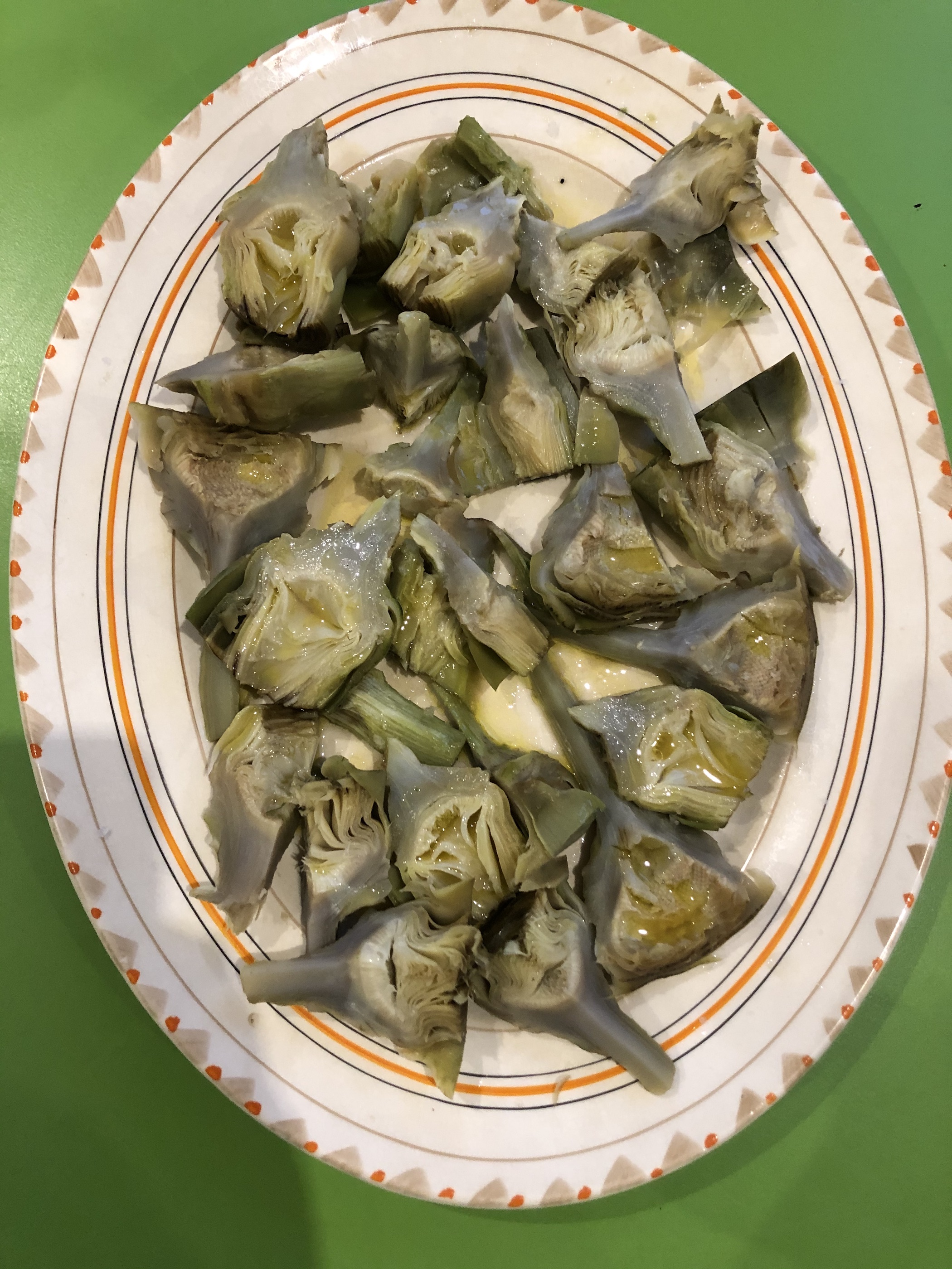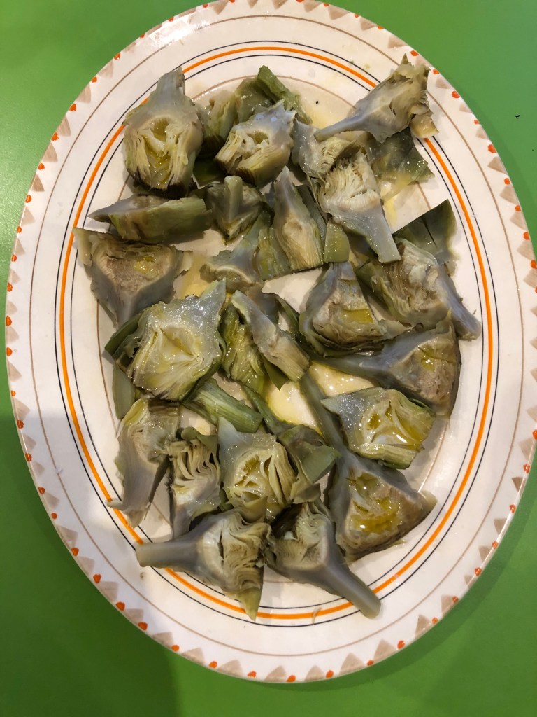 small purple artichokes from the allotment, trimmed of tough bits then boiled in salted water until tender, then halved or quartered and laid on a large plate and dressed with red wine vinegar, olive oil and salt and pepper. served room temperature with toast dressed with more olive oil and salt